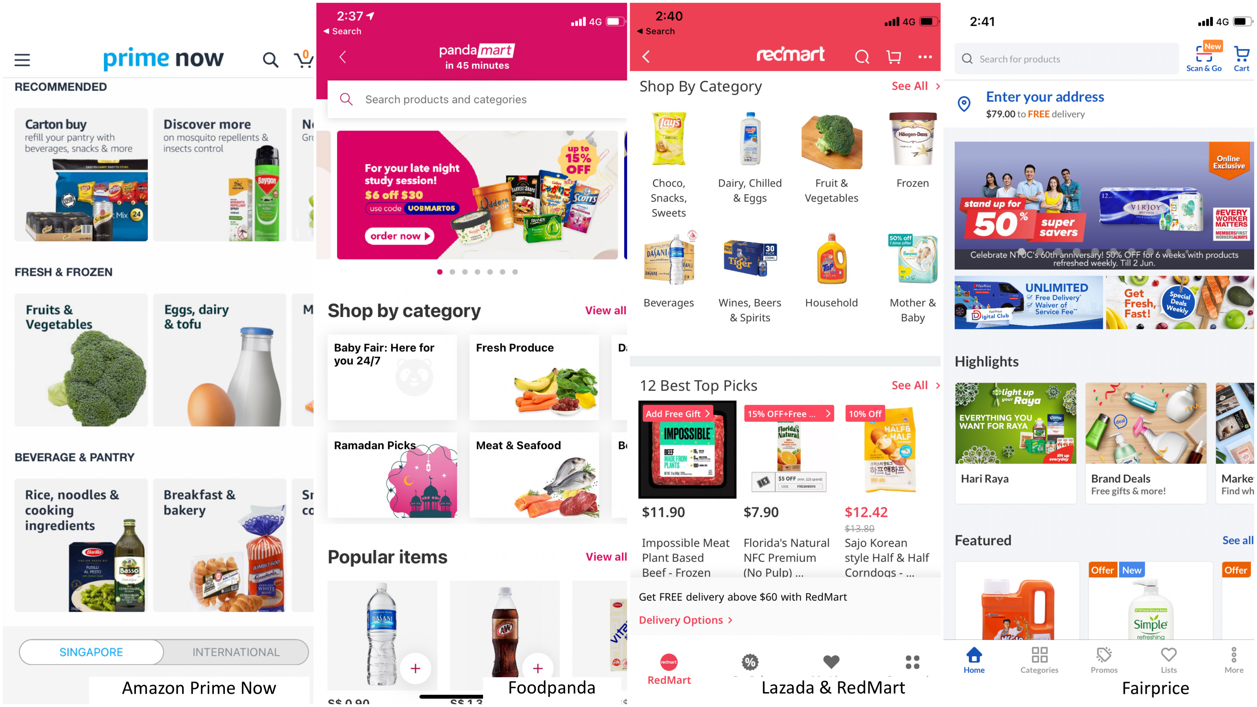 Images taken from Amazon Prime Now, Foodpanda, Lazada and Fairprice apps