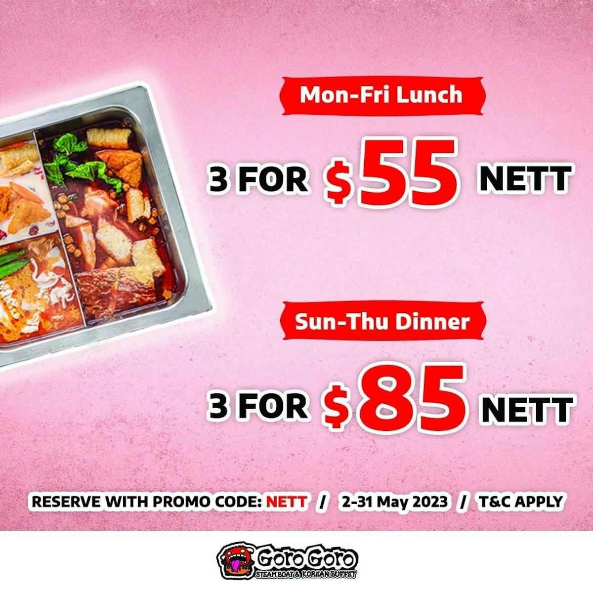 GoroGoro Steamboat & Korean Buffet is currently offering a May Nett Promo for their hotpot buffet. The promo allows three diners to enjoy the hotpot buffet for 3 at just $55 NETT. The regular price for the same deal is $67.